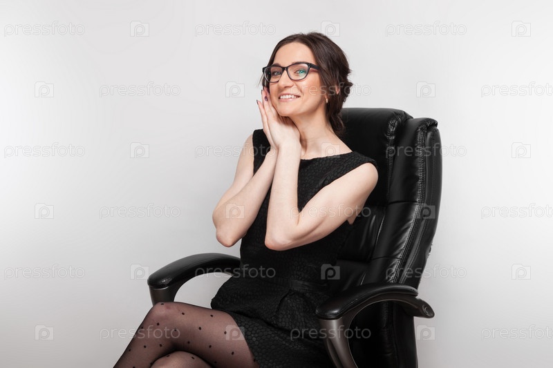 Изолированная на сером, красивая кавказская брюнетка, одетая в черное чешуйчатое платье, колготки и очки сидят на кожаном стуле, скрестив ноги, улыбаясь