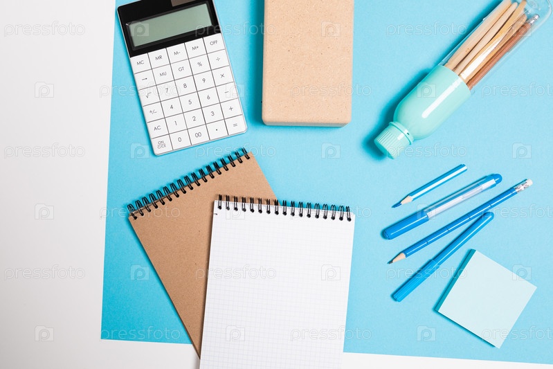 Канцелярский калькулятор с макетом лежит на столе. вид сверху на офисное рабочее место