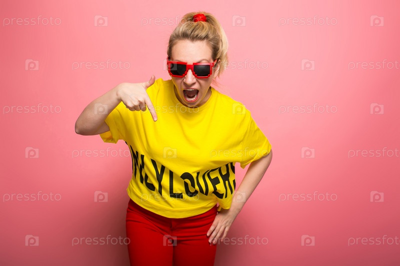 Привлекательная женщина в желтой футболке, красных джинсах и солнцезащитных очках, указывающих пальцем вниз, изолирована на розовом фоне с концепцией распродажи со скидкой приглашение copyspace