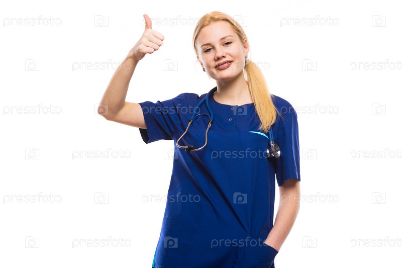 Портрет молодой веселой женщины-медицинского стажера или хирурга в синих халатах со стетоскопом, держащим большой палец на белом фоне с концепцией успешной операции copyspace