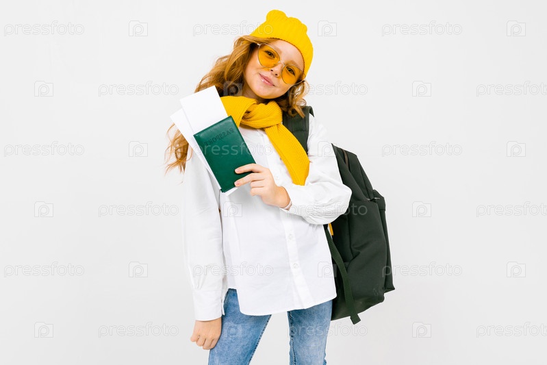 Девушка с рюкзаком на плечах держит паспорт с билетами на отдых на белом фоне с копией пространства