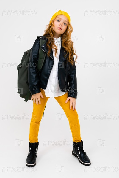 Фотография в полный рост стильной девушки-подростка в белой рубашке, черной кожаной куртке, желтых брюках и желтой шляпе, с рюкзаком на плечах, позирующей на белом фоне