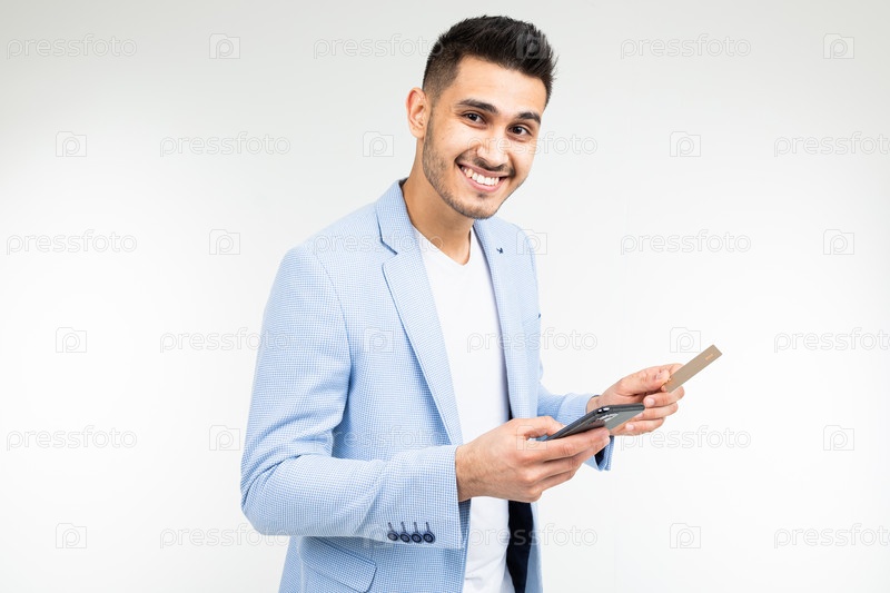 Мужчина вводит данные с кредитной карты в мобильный телефон, чтобы совершить покупку через Интернет на белом фоне