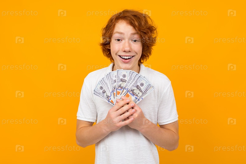 Парень в белой рубашке держит выигранные деньги на желтом фоне с копией пространства