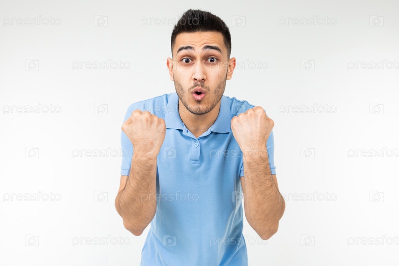 Красивый кавказец в синей футболке радуется победе, держа кулаки на белом фоне студии