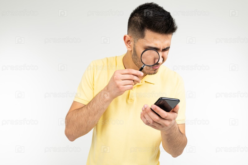 Красивый мужчина с близорукостью держит в руке лупу и смартфон на белом фоне с копией пространства