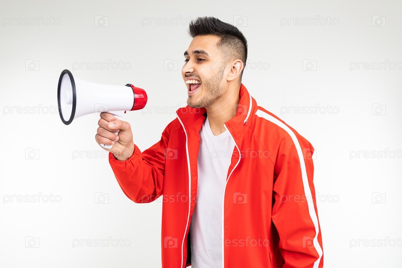 Брутальный мужчина в спортивной форме с громкоговорителем на фоне белой студии