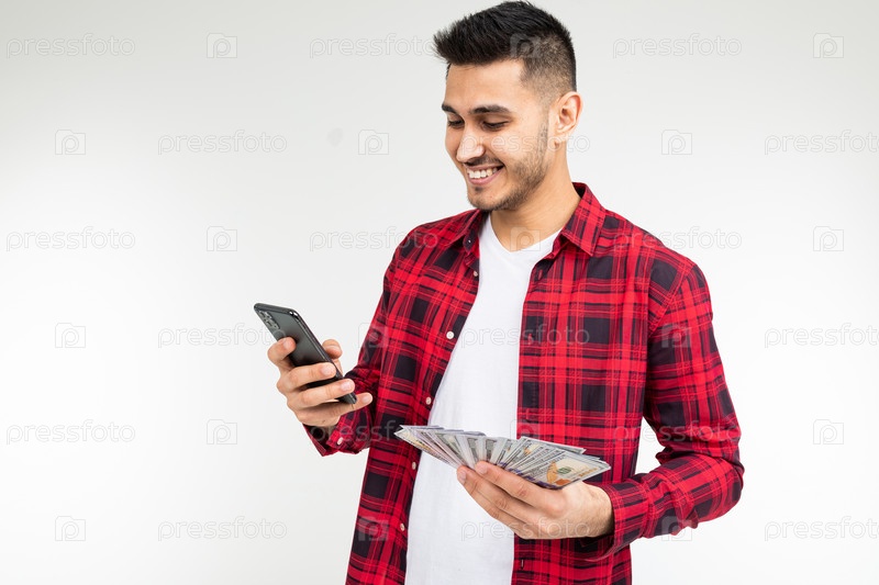 Парень в клетчатой рубашке сообщает о выигрыше денег по телефону на белом фоне с копией пространства