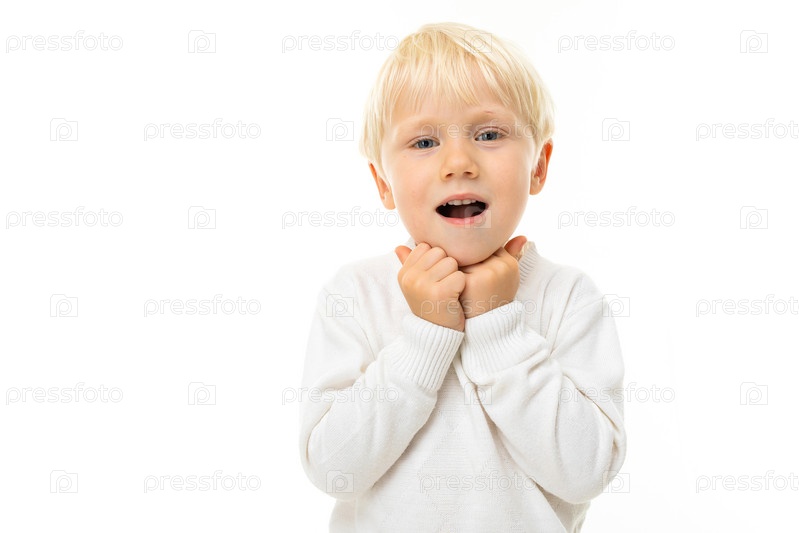 Маленький мальчик с короткими светлыми волосами, голубыми глазами, симпатичной внешностью, в белой куртке, голубых штанах стоит и удивляется