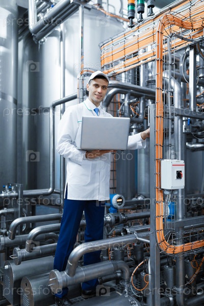 Портрет мужчины в белом халате и кепке, стоящего в производственном цехе молочной фабрики с ноутбуком