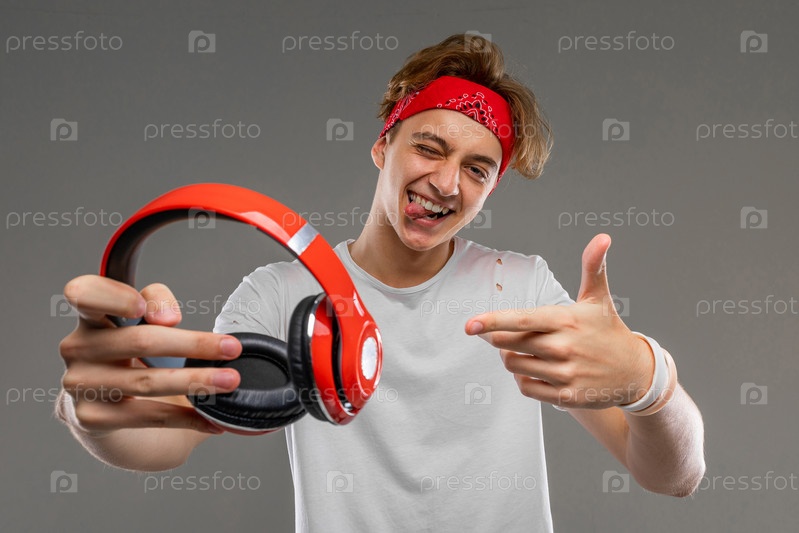 Парень протягивает большие наушники, чтобы слушать музыку на сером фоне