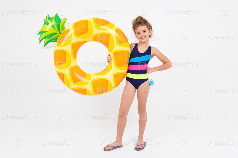 Счастливая девушка-подросток на летних каникулах у моря с плавательными кругами на белом фоне