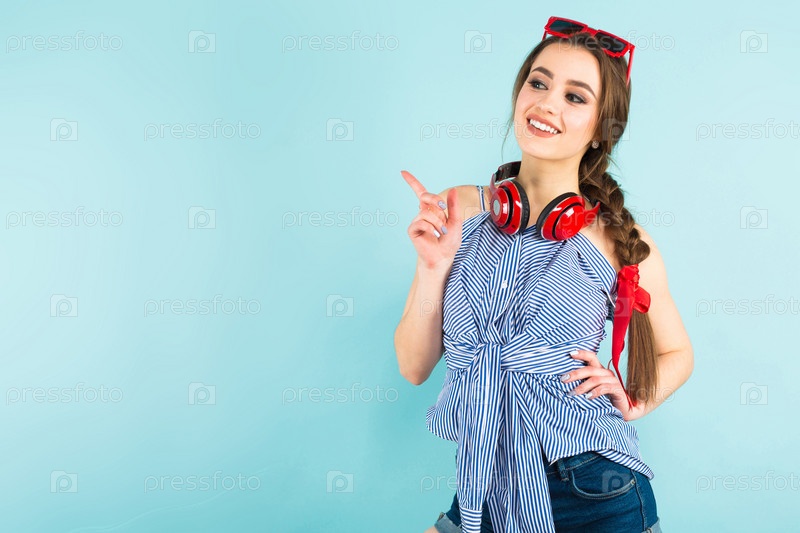 Брюнетка веселая молодая женщина-диджей в полосатой рубашке и солнцезащитных очках на синем фоне с копирайтом, держащая красные наушники на шее и веселящаяся