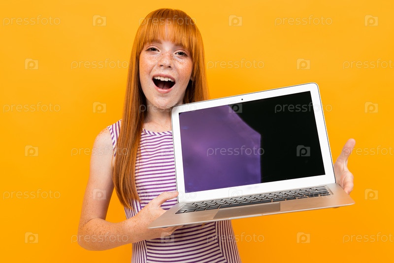 Красивая женщина с рыжими волосами работает с ноутбуком на желтом фоне