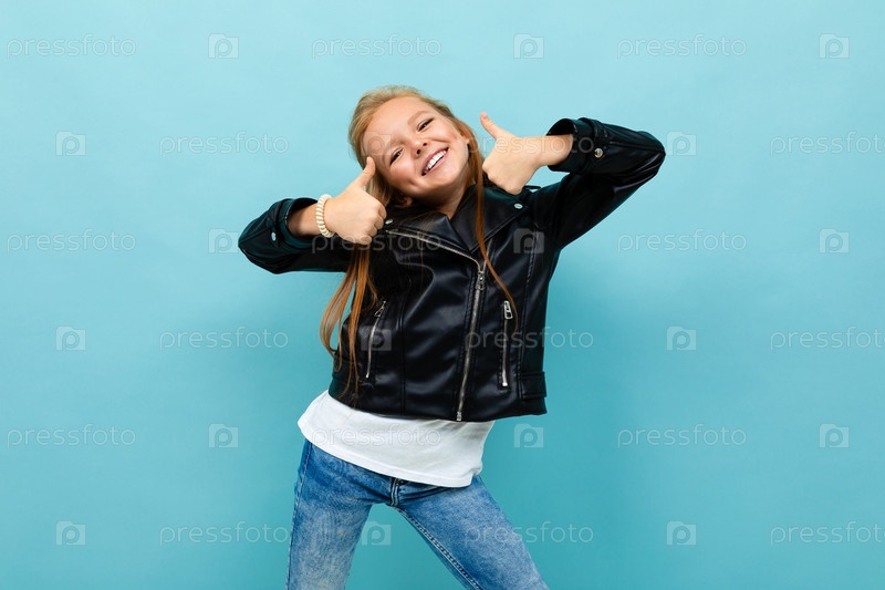 Милая девушка в повседневном образе с кожаной курткой и джинсами показывает класс на голубом фоне