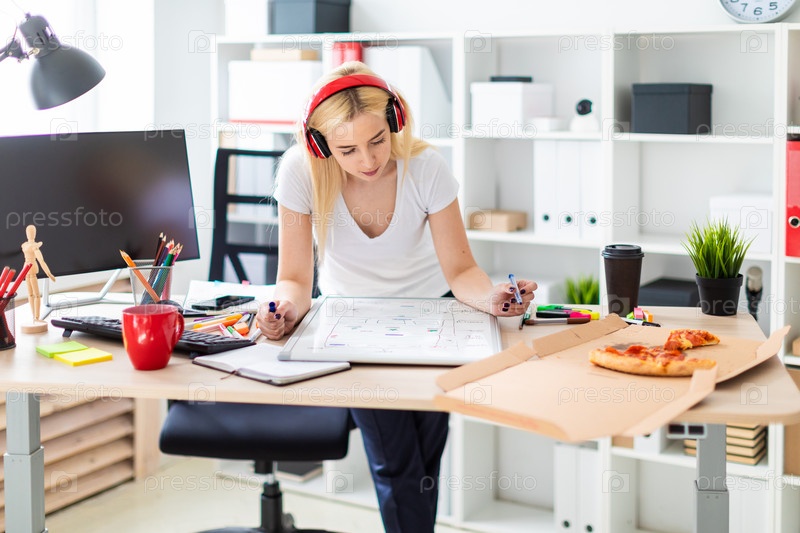 Красивая блондинка в белой майке и темных брюках. Девушка слушает музыку через красные наушники и работает с маркером и магнитной доской в светлом шкафу. фото с глубиной резкости