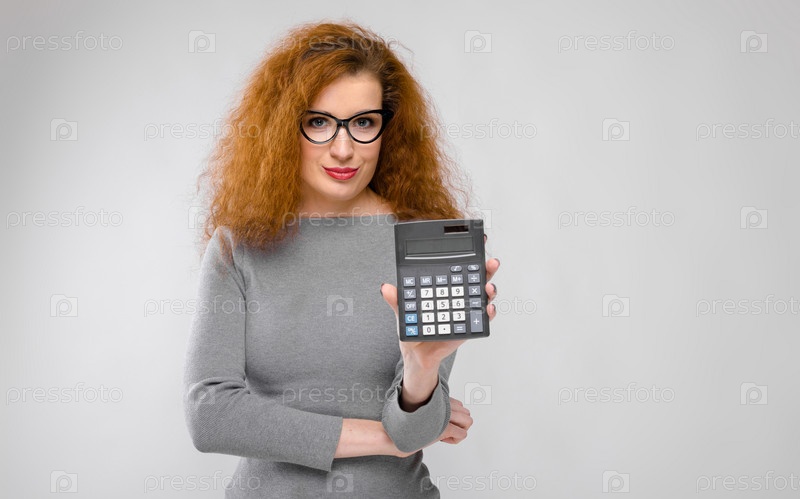 Портрет красивой рыжеволосой успешной счастливой улыбающейся молодой женщины в серой одежде в очках, показывающей калькулятор на сером фоне