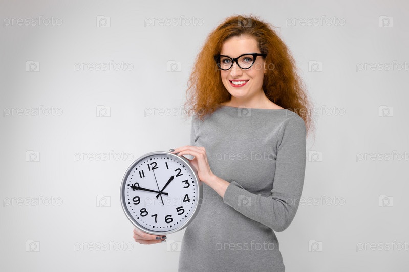 Очаровательная молодая девушка с рыжими волосами. Молодая девушка в сером свитере. Молодая девушка на сером фоне. Молодая девушка в очках держит часы
