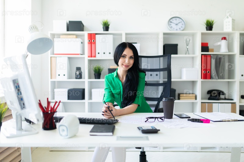 Молодая девушка сидит за офисным столом и держит в руках карандаш