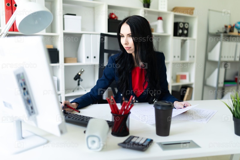 Красивая молодая девушка, работающая с компьютером и документами в офисе за столом
