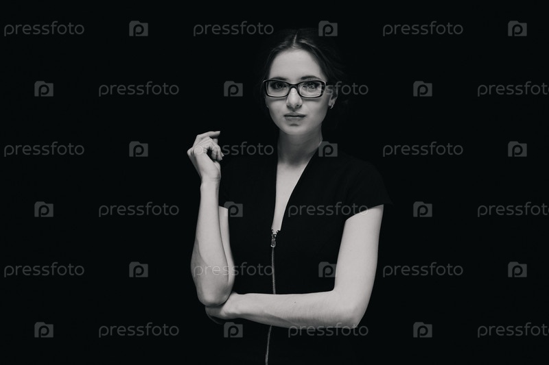 Черно-белый портрет уверенной в себе красивой молодой деловой женщины, стоящей в офисе на черном фоне