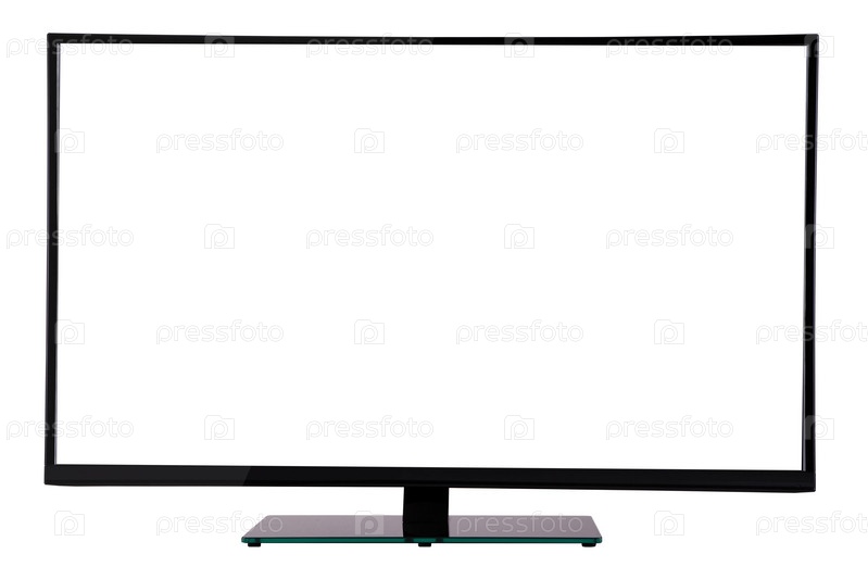 Современный тонкий плазменный телевизор на подставке из черного стекла, изолированной на белом фоне
