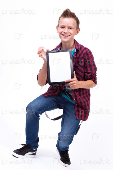 Успешный студент с планшетом в руке показывает клиенту на