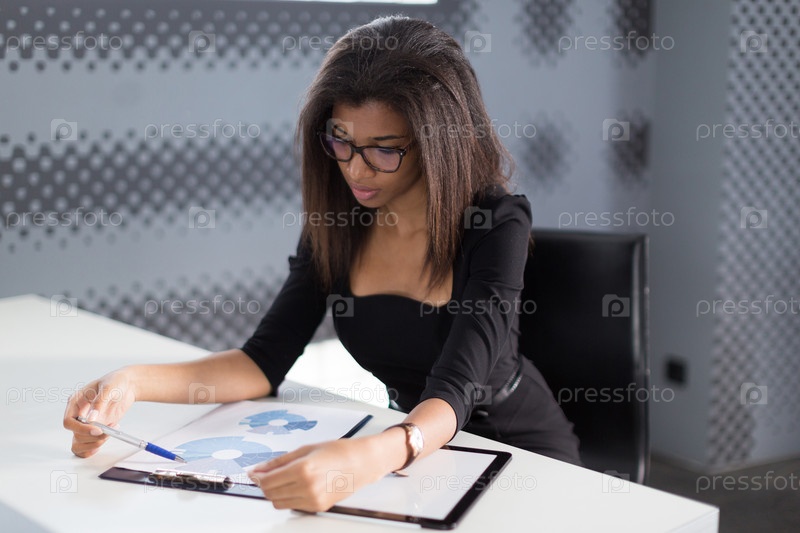 Привлекательная молодая бизнес-леди в черном сильном костюме сидит за офисным столом