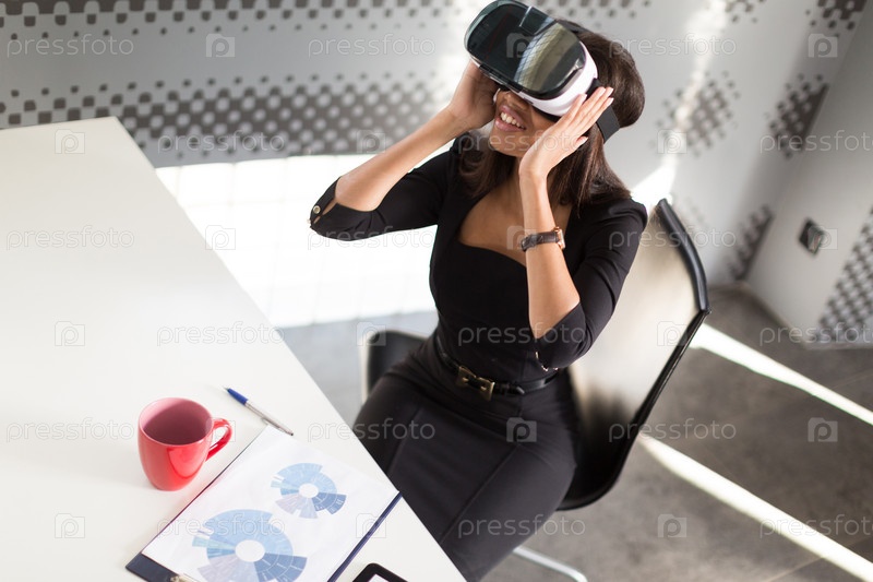 Красивая молодая брюнетка афроамериканская бизнес-леди в черном деловом костюме, очках и дорогих часах сидит за столом в офисе, красная чашка на столе, сидит в очках виртуальной реальности, держит очки