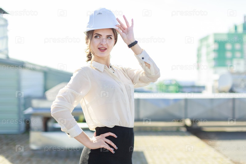 Красивая бизнес-леди в белой блузке, часах, шлеме и черной юбке стоит на крыше