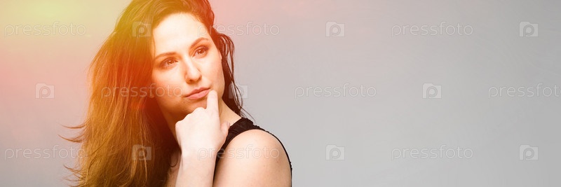 Эмоциональная довольно самоуверенная симпатичная модель плюс-size, стоящая в студии и демонстрирующая свою красоту на сером фоне