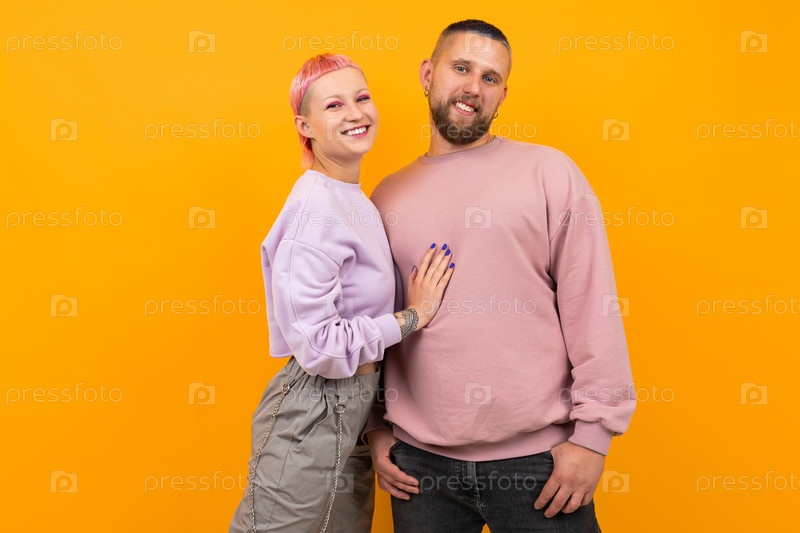 Необычная красивая женщина с короткими розовыми волосами и татуировкой наслаждается жизнью со своим парнем на оранжевом фоне