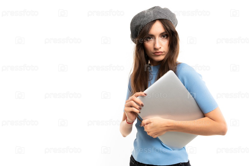 Европейская девушка с закрытым ноутбуком в руках на белом фоне