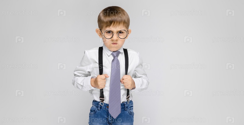 Очаровательный мальчик в белой рубашке, подтяжках, галстуке и светлых джинсах стоит на сером фоне. Мальчик держит руки за брекеты