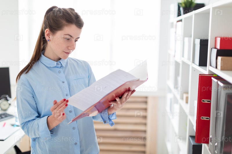 Очаровательная рыжеволосая девушка в синей блузке работает в ярком офисе. фото с глубиной резкости