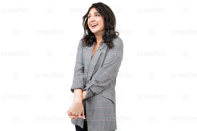 Скромная милая девушка с черными волосами в сером клетчатом пиджаке на белом фоне с копией пространства