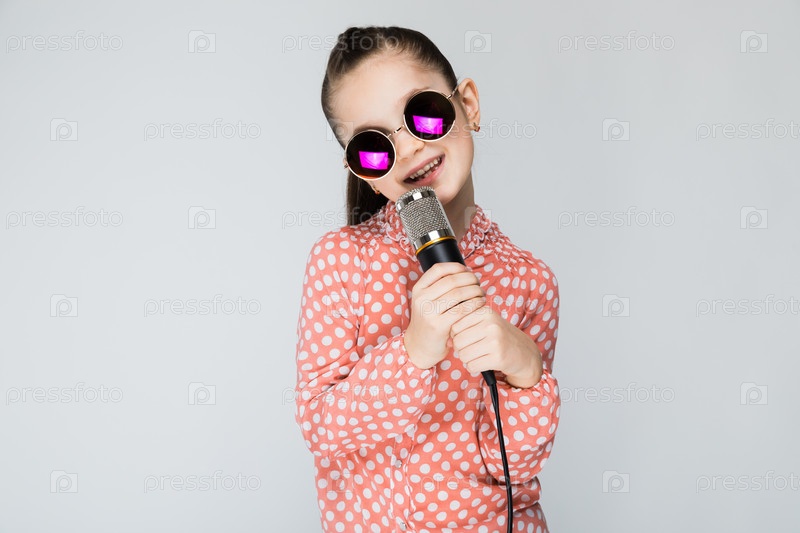 Девушка в оранжевой рубашке, очках и синих джинсах на сером фоне