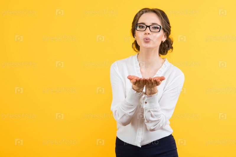 Портрет уверенной в себе красивой молодой улыбающейся счастливой деловой женщины, посылающей воздушный поцелуй на желтом фоне