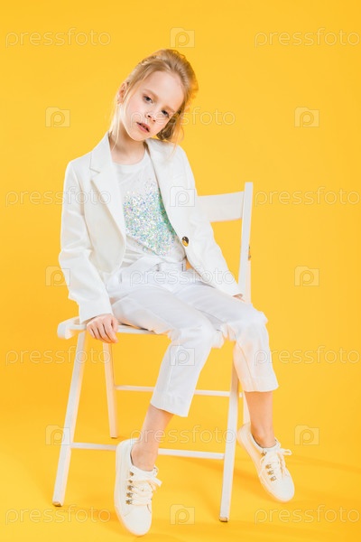 Девочка-подросток в белой одежде сидит на стуле на желтом фоне