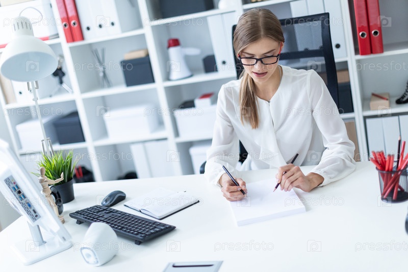 Молодая девушка сидит за столом в офисе и держит в руках карандаши. Перед девушкой лежит открытая книга