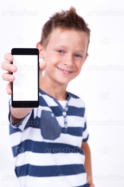 Успешный студент с телефоном в руке показывает клиенту на белом фоне фотографию приложения с глубиной резкости