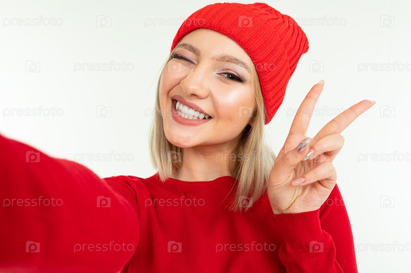 Селфи блондинка в красной шапке и свитере на белом фоне