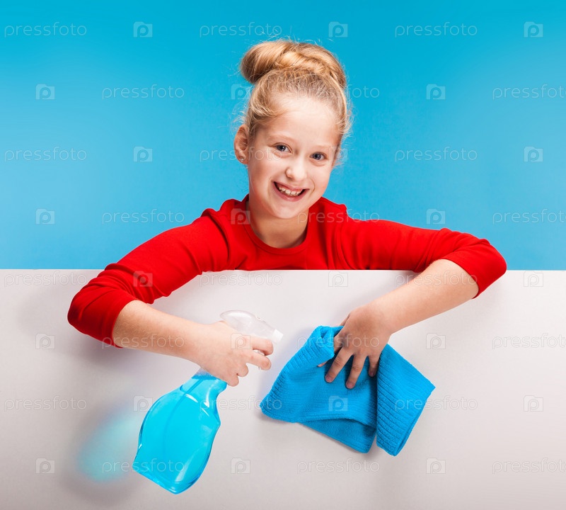 Улыбающаяся девушка с баллончиком и синей тряпкой