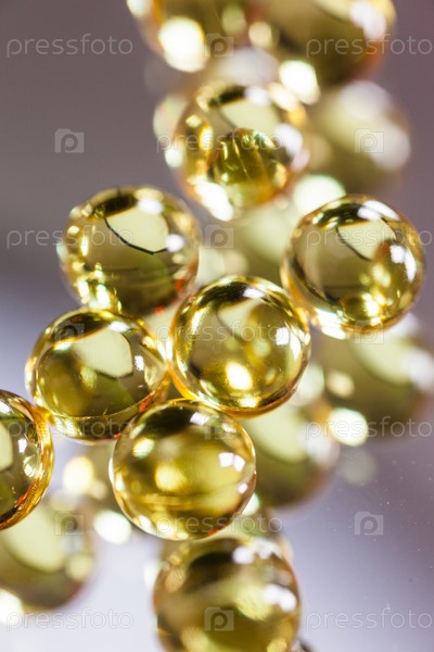 Желтые капсулы на зеркальном фоне, макро, фото с глубиной резкости