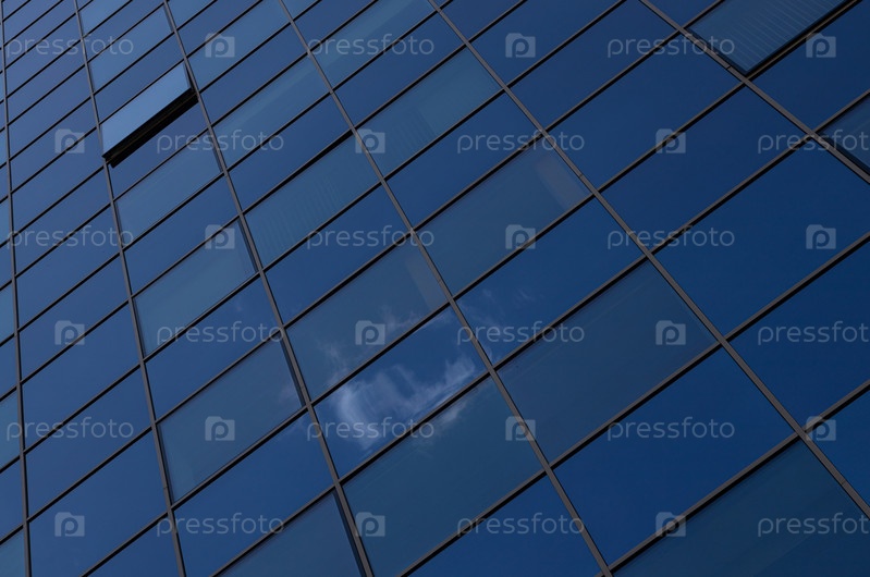 Вид с земли на голубую стеклянную поверхность стены здания, отражающую голубое небо с облаками