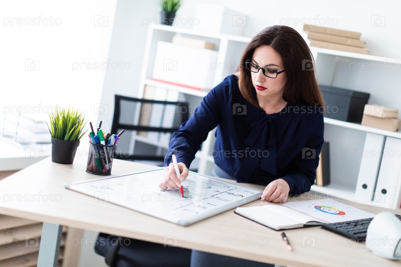Красивая девушка работает в светлом офисе. Девушка одета в светлую блузку и темные брюки. У нее длинные темные волосы и красивый макияж. фото с глубиной резкости