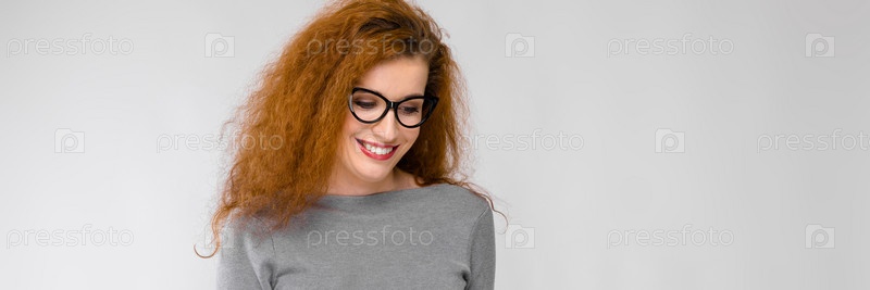 Красивая кавказская молодая девушка с красными губами и вьющимися волосами, смотрящая в камеру, стоящая в офисе на сером фоне и пишущая в буфер обмена