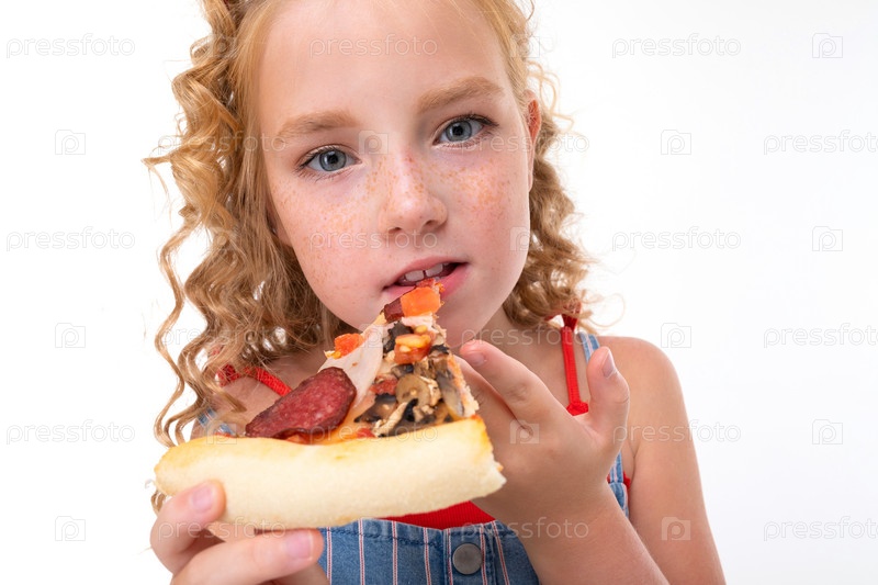 Маленькая девочка с рыжими волосами в красной майке и сине-белом комбинезоне в полоску ест большую пиццу