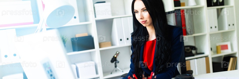 Портрет молодой девушки в костюме. Красивая девушка работает в офисе