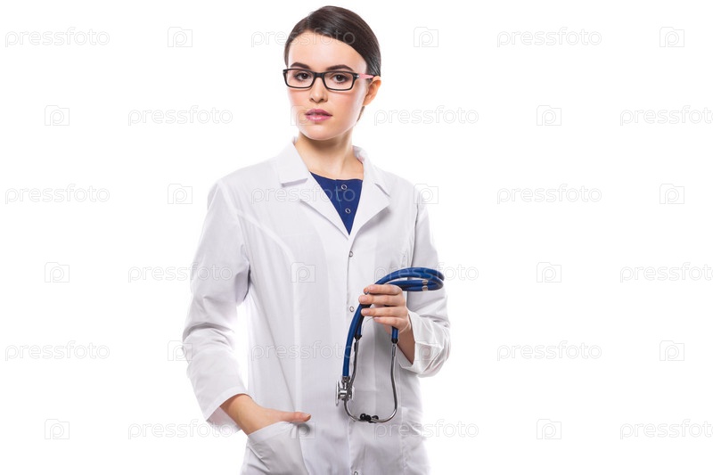 Портрет молодой красивой брюнетки кавказской женщины-врача в белом халате, стоящей в офисе и смотрящей в камеру, ожидающей пациента, уверенного в себе дружелюбного опытного опытного врача